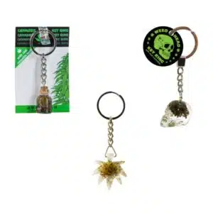 Llaveros hechos a mano con auténtico cogollo de Cannabis Sativa L. en varias formas.