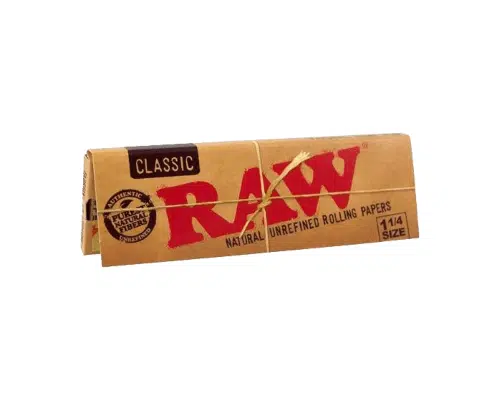 El papel de liar Raw 1 ¼ Classic es un papel 100% libres de cloro y no blanqueado, lo que da un color cobrizo claro natural debido a la mezcla híbrida y fibras sin blanquear, resultando en un un delgado papel de fumar prácticamente dorado. El papel es individual con marca de agua en forma de cruz que ayuda a prevenir las carreras y crea un papel más duradero durante la quema. Una vez listo, el sabor es limpio, puro y natural. Un solo paquete contiene 50 hojas.